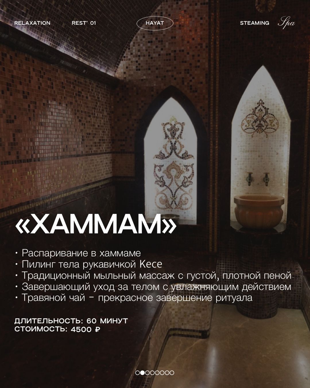 Тепло турецкого пара, нежность водяного массажа и ароматы эфирных масел позволят вам расслабиться и забыть обо всех повседневных проблемах и стрессах